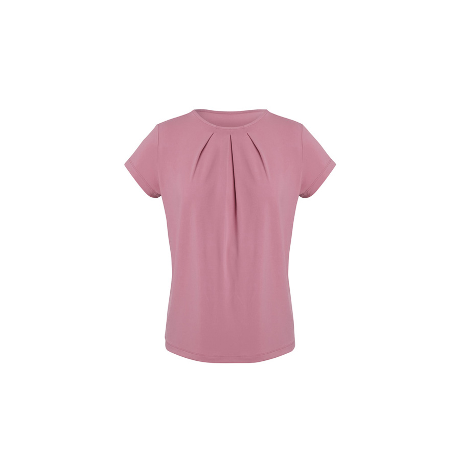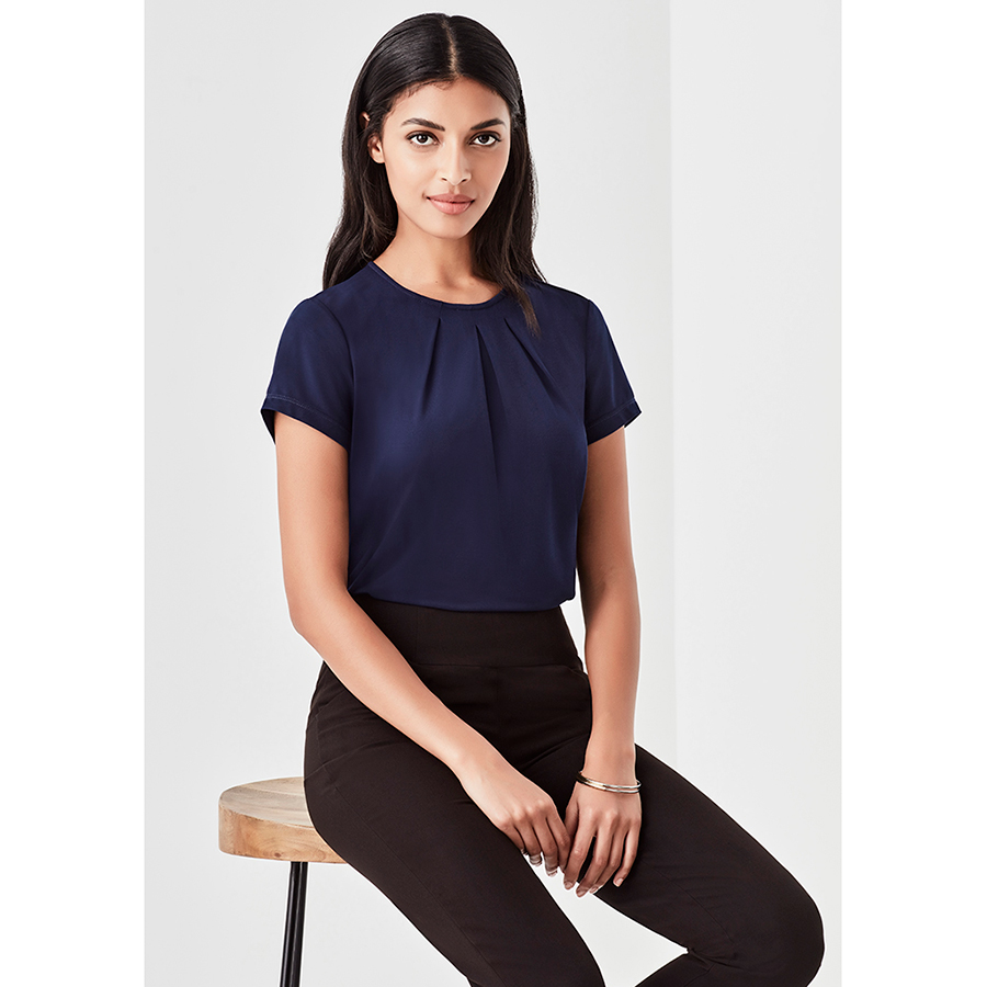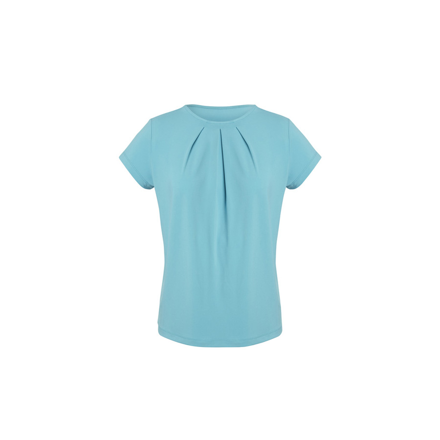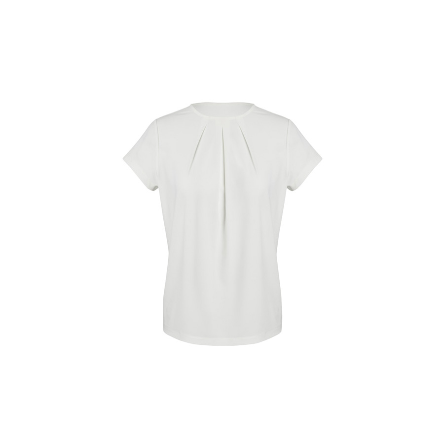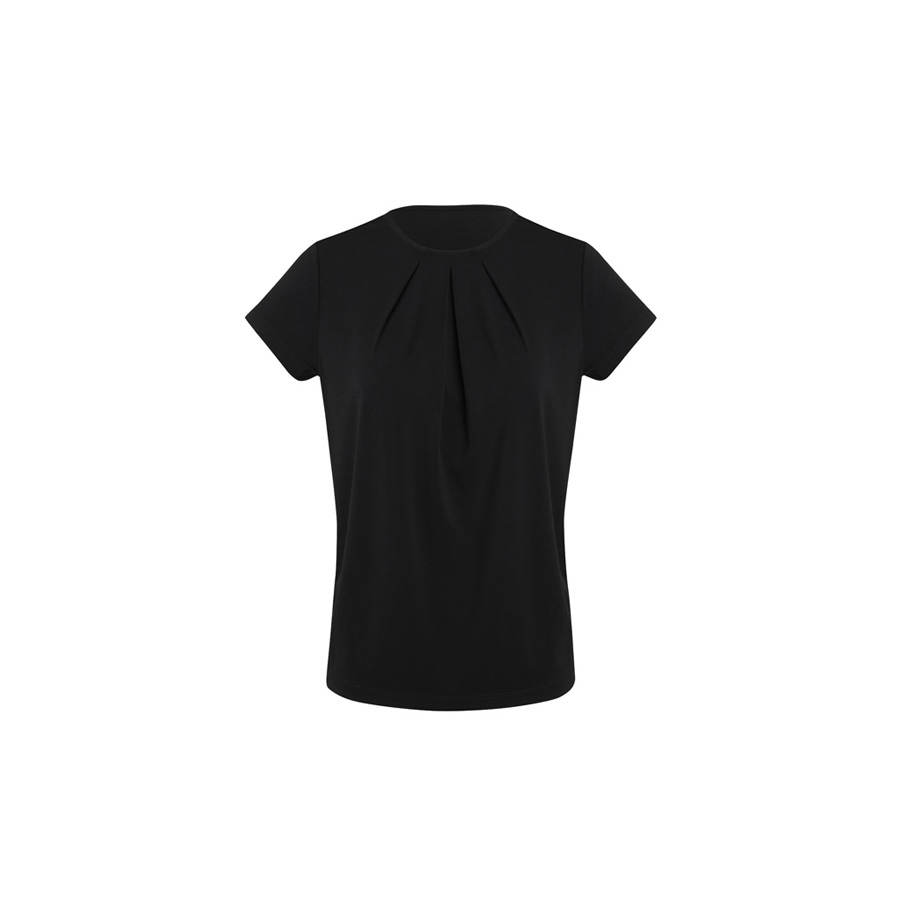 This short-sleeved style has a classic crew neckline with pleat details. Designed to be a semi-fitted top. Wear yours tucked in or out.