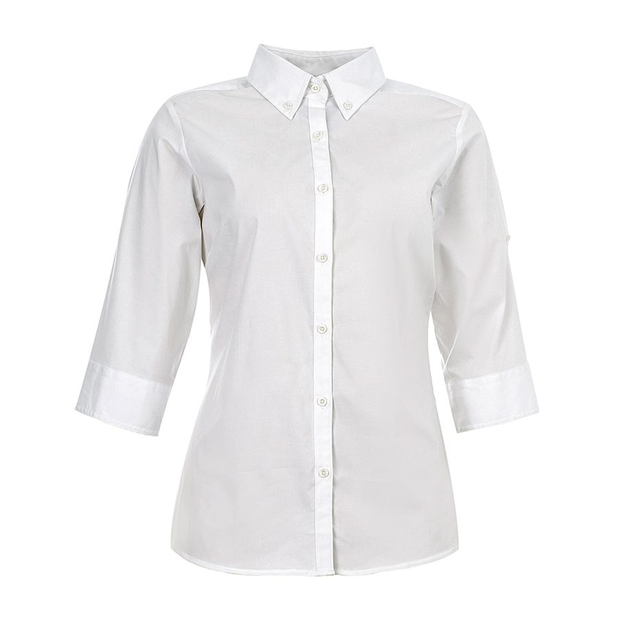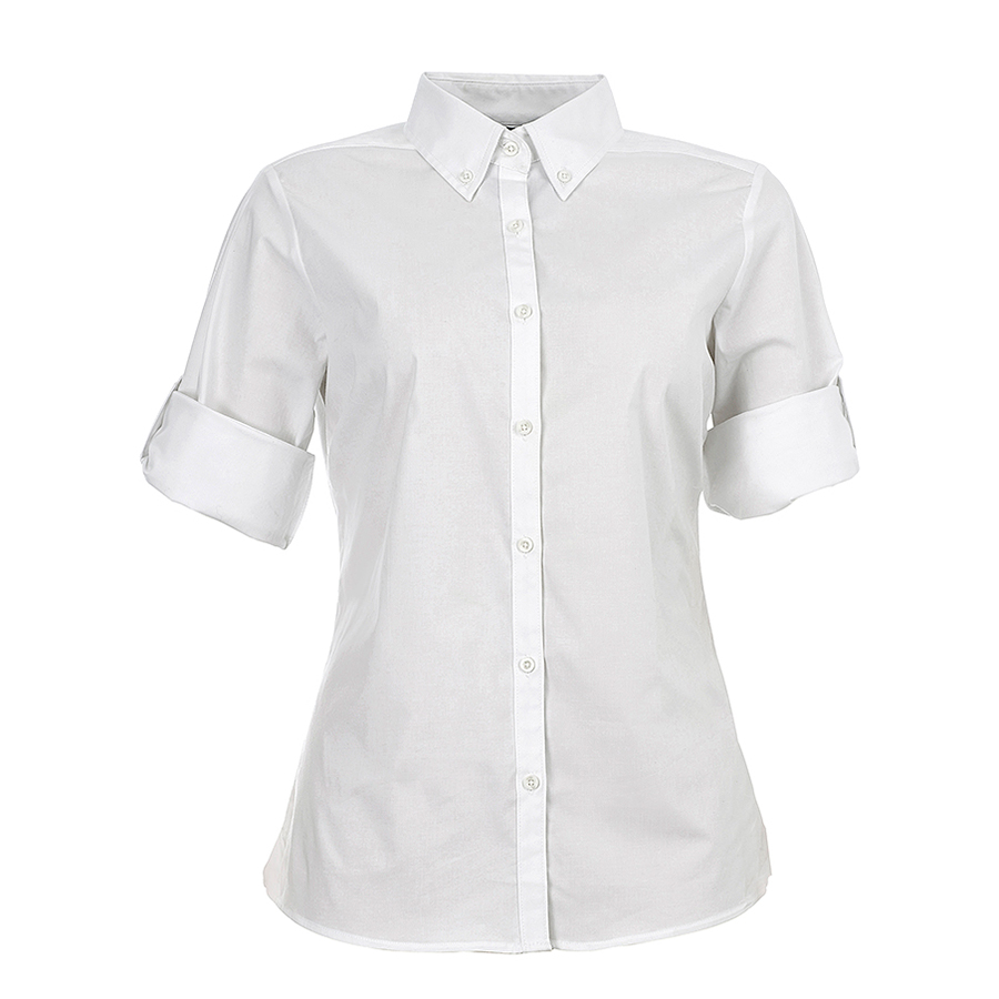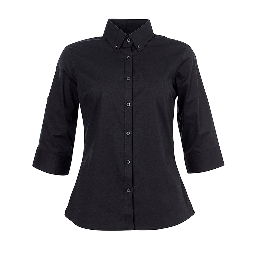 Ladies 34 Sleeve Stretch Shirt Cotton rich. 34% polyester 62% cotton 4% spandex. Button Down Collar. Tonal horn buttons SIZE RANGE 8 – 26