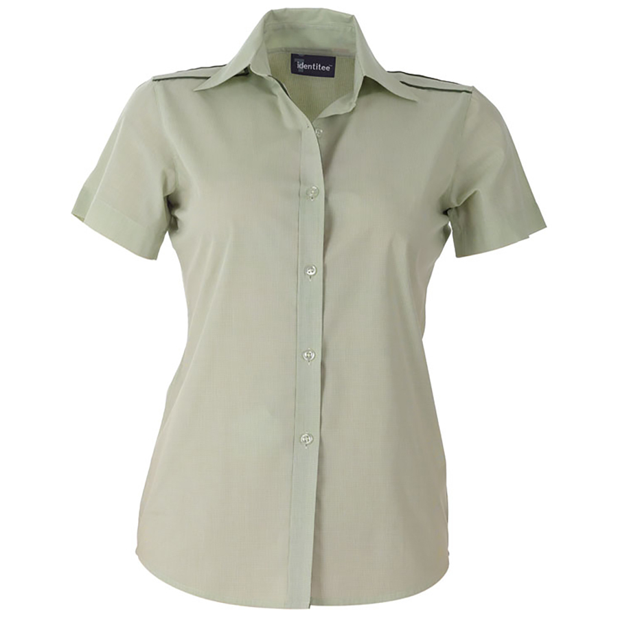 Ladies Short Sleeve Mini Check Shirt with Epaulette 60% cotton 40% polyester. Mini Check. Contrast trim details to match. Stitched down eppaulette. Placket sleeve cuff. Gentle curve hem SIZE RANGE 8 – 22