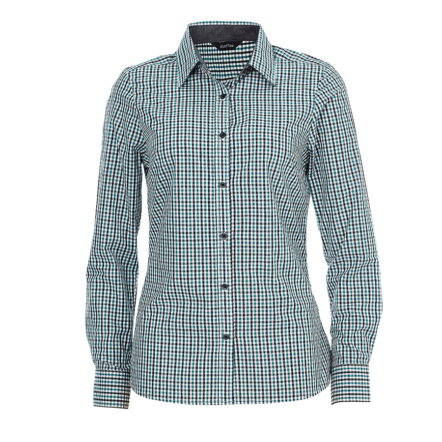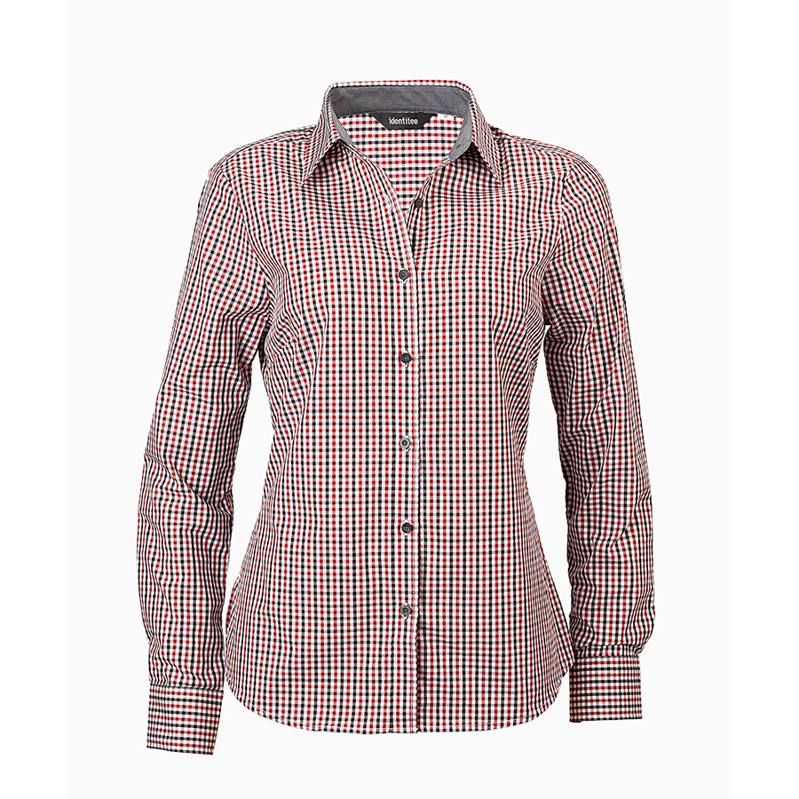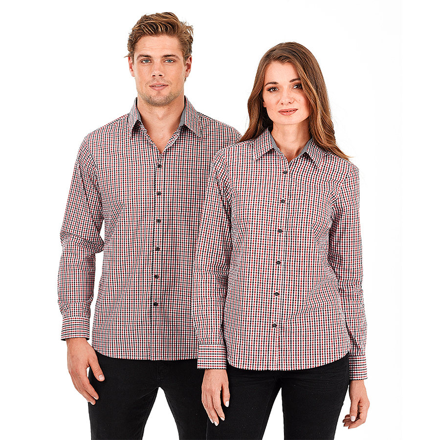 Ladies Long Sleeve Double Gingham Check Shirt 60% Cotton 40% polyester. Yarn dyed gingham check. Easy care. Contrast inner collar & inner cuff. Horn buttons SIZE RANGE 8 – 26
