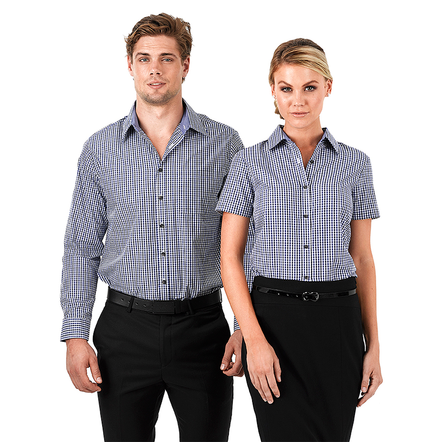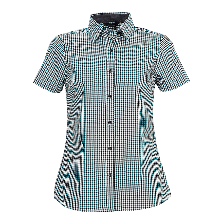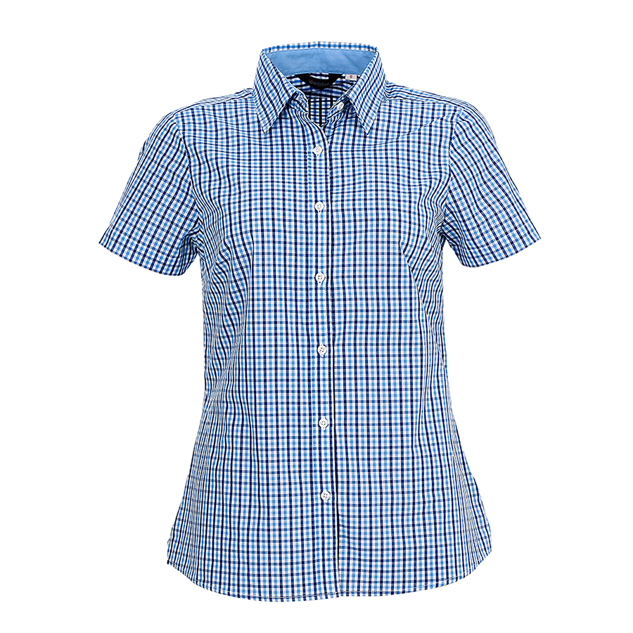 Ladies Short Sleeve Double Gingham Check Shirt 60% Cotton 40% polyester. Yarn dyed gingham check. Easy care. Contrast inner collar. Horn buttons SIZE RANGE 8 – 26