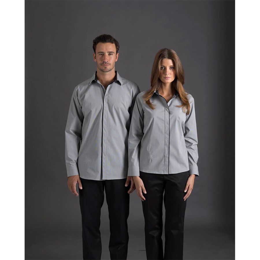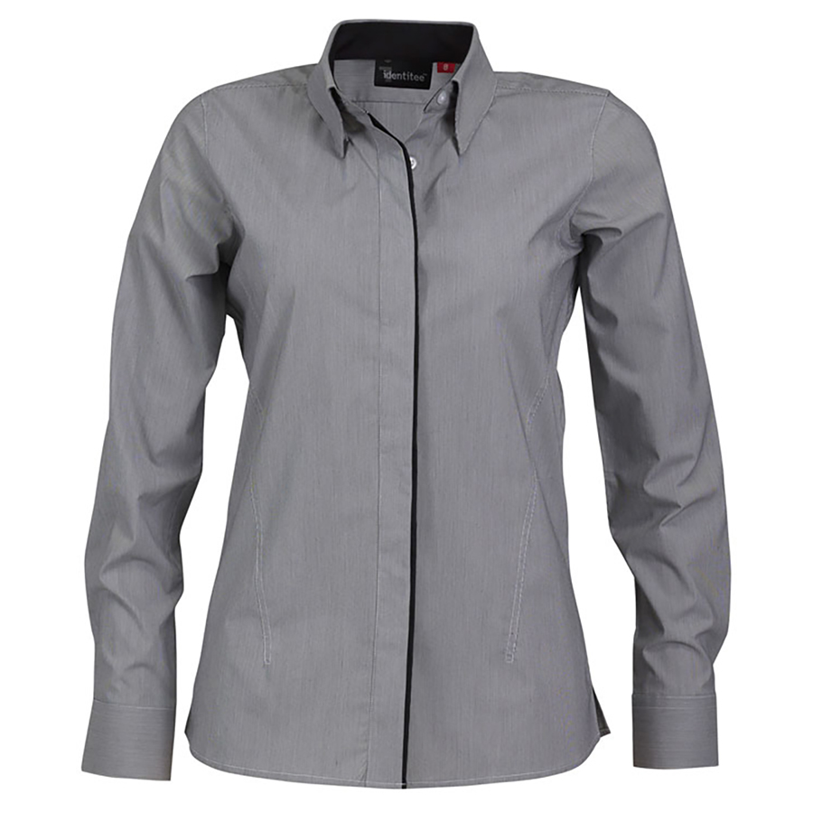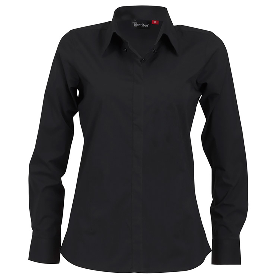 Ladies Long Sleeve Stretch Shirt with Concealed Placket 60% polyester 35% cotton 5% spandex. Concealed placket with edging. Contoured front seams for superior fit. Button down collar. Gentle curve hem SIZE RANGE 8 – 26