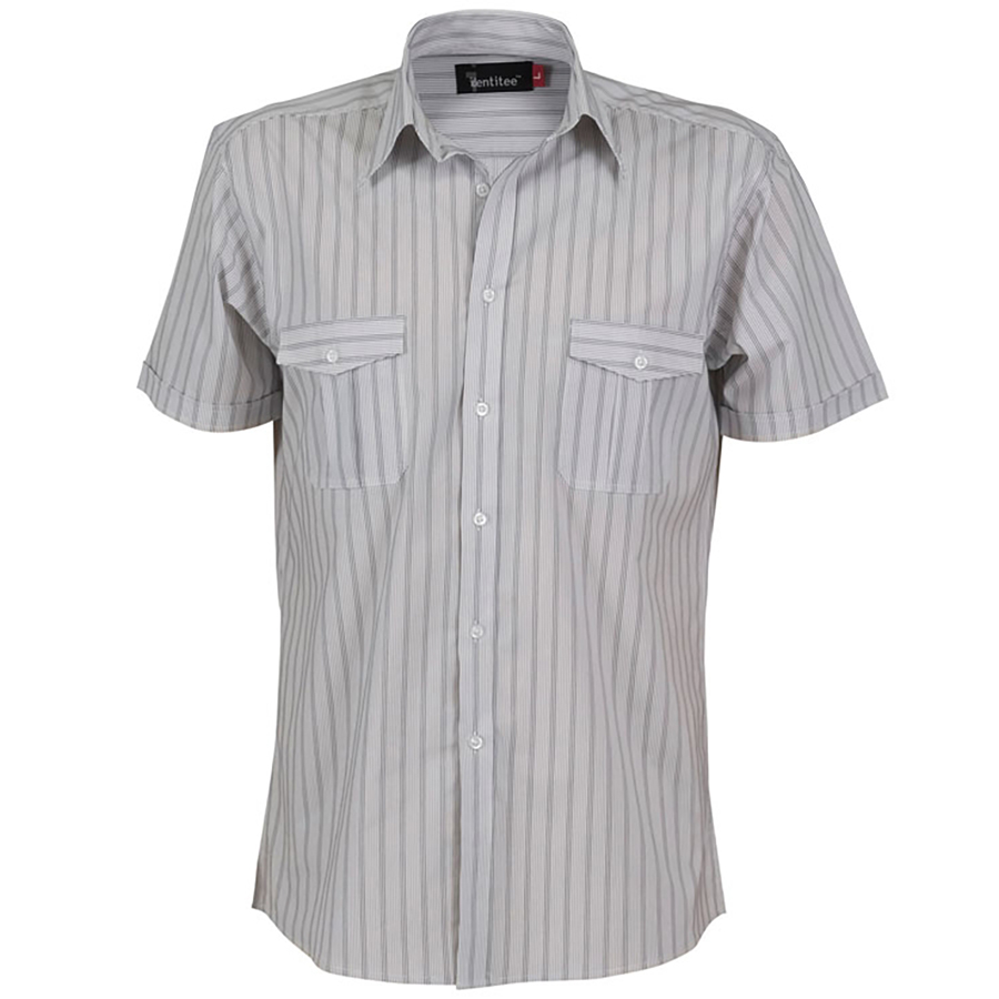 Mens Short Sleeve Stripe Shirt with Stretch 60% polyester 35% cotton 5% spandex. Stripe pattern. Twin pockets with flap. Pearl buttons. Gentle curve hem SIZE RANGE S – 5XL