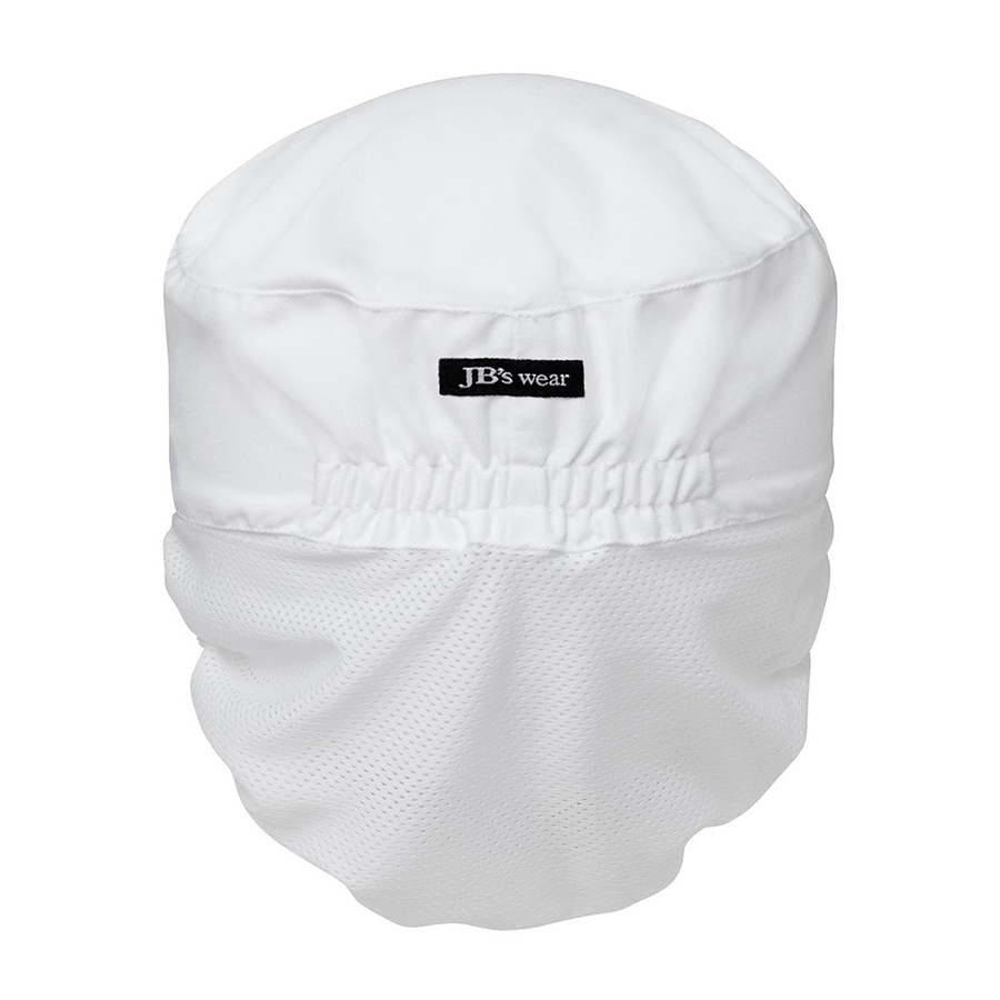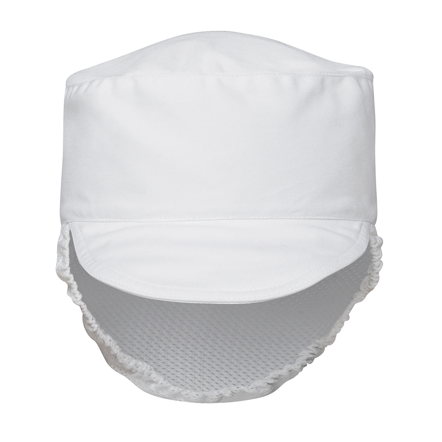 65% Polyester for durability. and 35% Cotton drill for comfort.Features peak cap. fitted mesh hair cover and elastic back to ensure hair is properly covered.One size Sizes: One Size