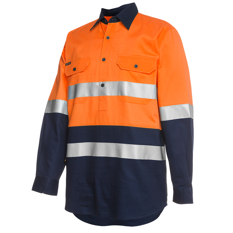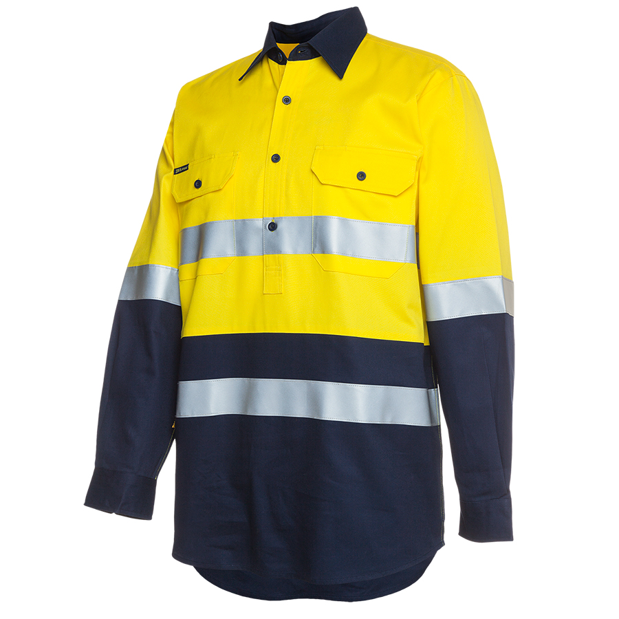 100% Cotton for 100% comfort.190gsm double pre-shrunk drill.Complies with Standard AS/NZS 4399:2016 for UPF Protection (UPF 50 ).Complies with Standards AS/NZS 1906.4:2010 and AS/NZS 4602.1:2011 Day and Night.Two front pockets with button-down flaps and pen insert.Curved hem with back tail styling.All pressure points bar tacked for extra strength and durability.Two-piece collar Sizes: XS|S|M|L|XL|2XL|3XL|4XL|5XL|6/7XL