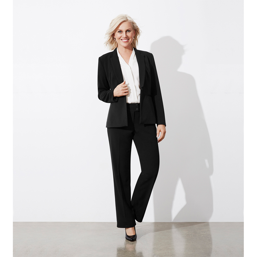 SIZES 4 – 26 FABRIC 4-way Stretch 62% Polyester 35% Viscose 3% Elastane Machine washable crease resistant easy care fabric FEATURES Fully lined with stretch lining for superior comfort Modern single button style notched tuxedo lapel tailored pockets Hidden internal lining zipper for embroidery access COLOURS Available in Navy or Black