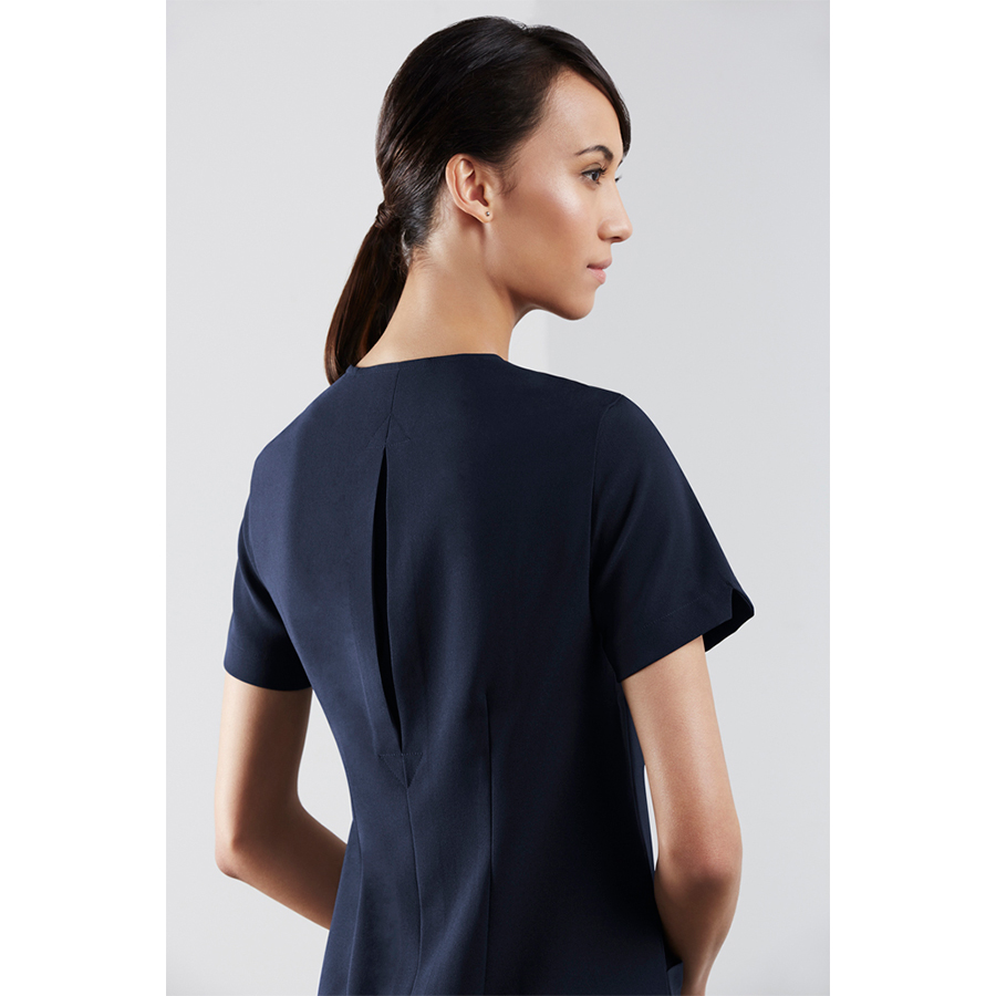 SIZES 6 – 20 FABRIC 97% Polyester 3% Elastane New Teflon? stain release stretch fabric 230 GSM FEATURES Semi-fitted concealed button through front with 2 lower front pockets Collarless with ?V? shaped neck detail Centre back action-back pleat Longer line with deep side splits