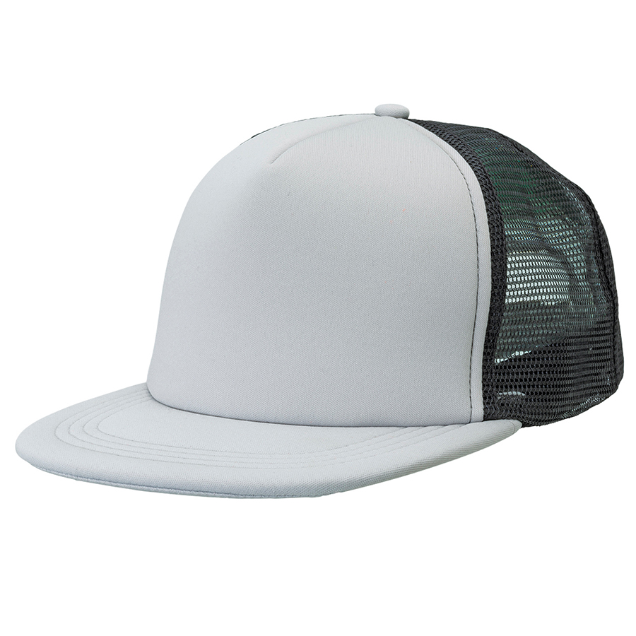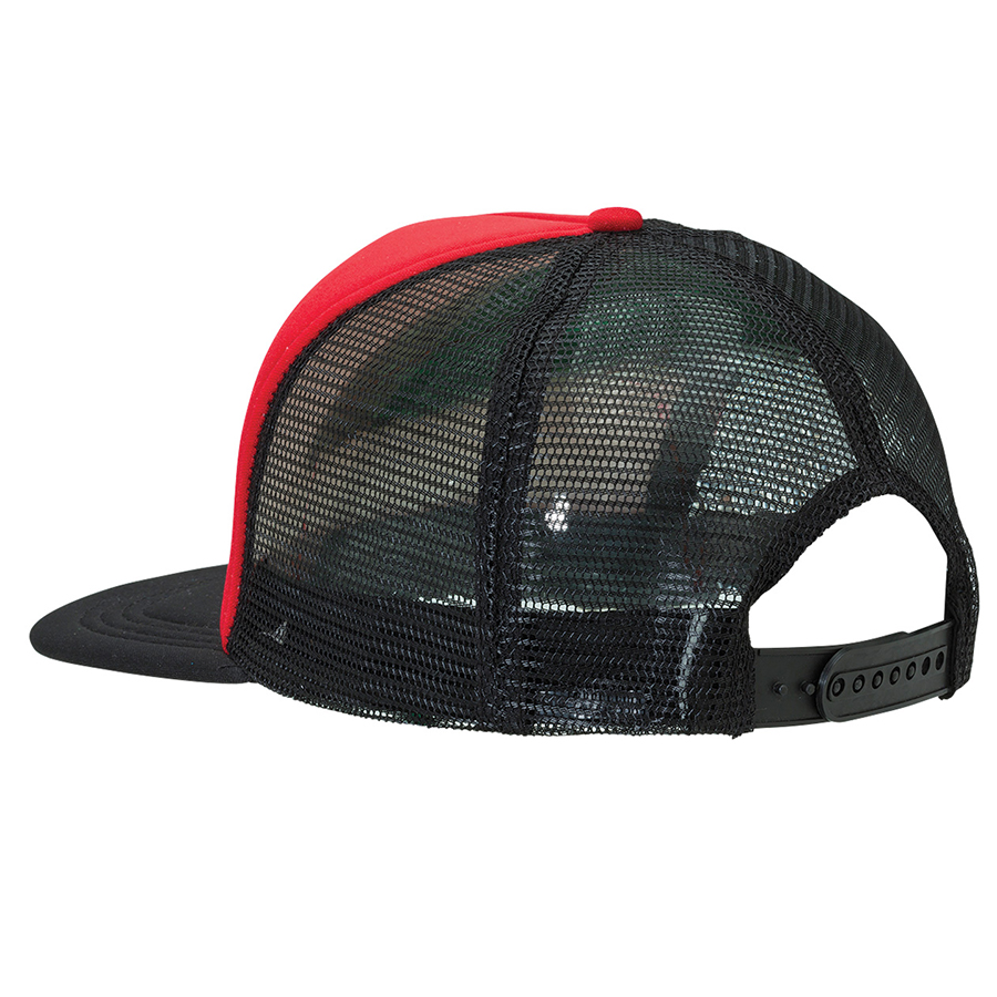 Popular in the surf/street and skate market. flat peak caps are a great fit for all. On trend and value. this cap ticks all the boxes. 5 panel design with flat peak|Padded polyester peak and front panel with nylon mesh side and back panel|Padded cotton sweatband|Adjustable plastic tab at rear