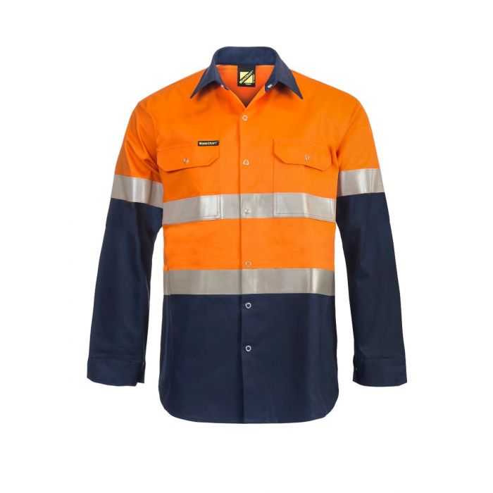NCC HI VIS TWO TONE LONG SLEEVE COTTON DRILL SHIRT WITH INDUSTRIAL LAUNDRY REFLECTIVE TAPE AND PRESS STUDS
