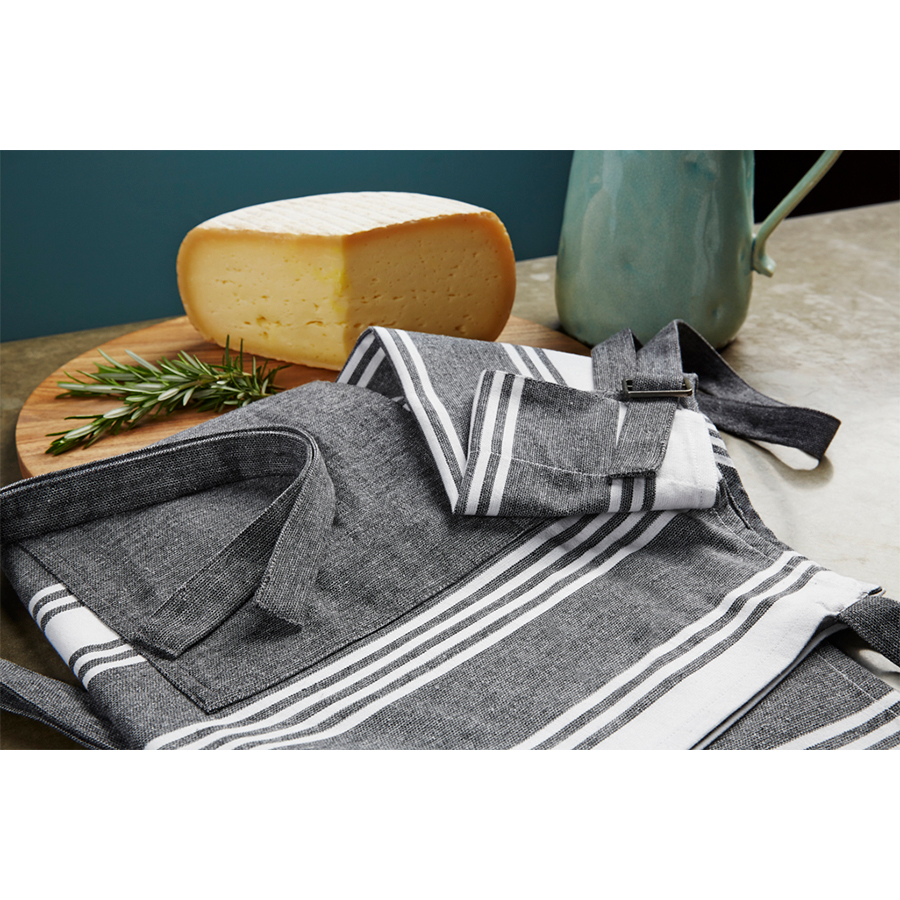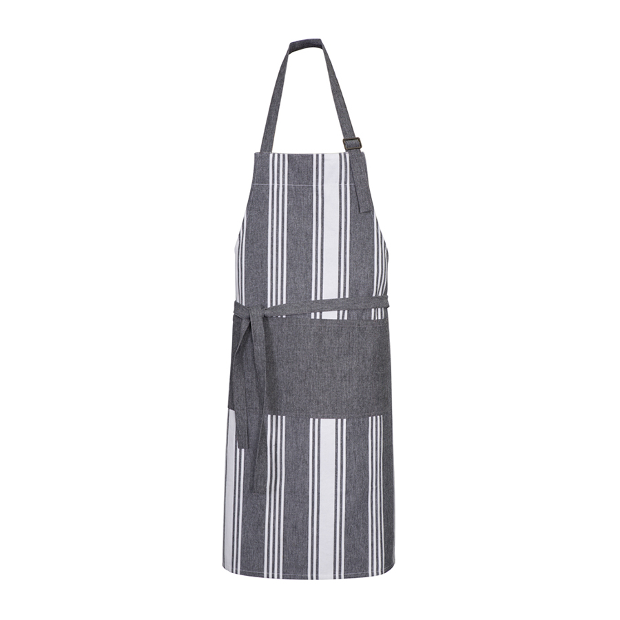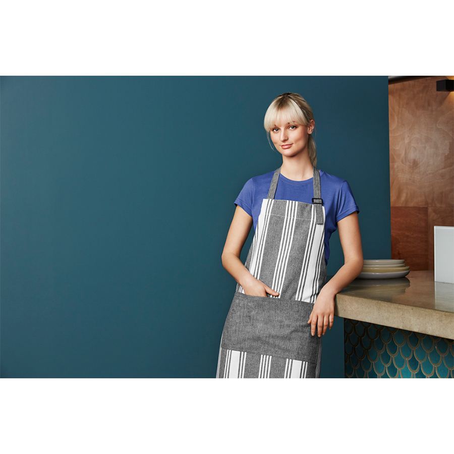 SIZES Free Size 93cm x 70cm FABRIC 100% Cotton quality textured fabric 240 GSM FEATURES Unique chambray statement stripe apron* Contrast divided front pocket with reinforced stitching Attached straps with adjustable D-ring neck loop Scalloped longer back tail for added warmth